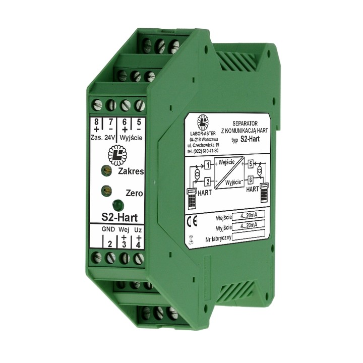 Separator S2-HART przenosząc sygnał 4÷20mA może pracować w systemach wykorzystujących cyfrowe techniki komunikacji HART (modulacja BELL 202) zapewniając separację galwaniczną miedzy obwodami wejście, wyjście i zasilanie. Przenosi dwukierunkowo różne protokoły transmisji danych dla inteligentnych przetworników w tym HART.